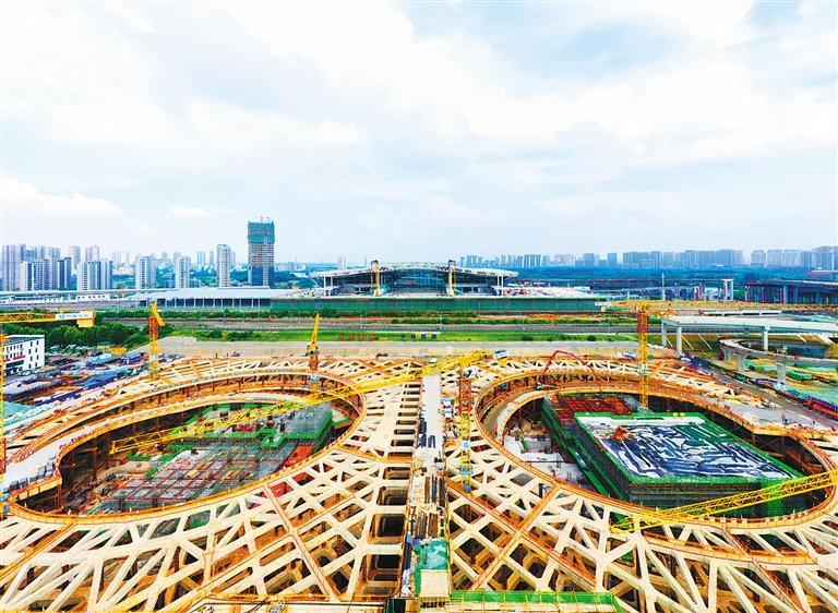 6月11日,新合肥西站项目建设现场一派忙碌景象。新合肥西站位于安徽省合肥市蜀山区,是国家“八纵八横”高速铁路主通道京港(台)通道主要车站,项目建成后将成为助推长三角一体化高质量发展的新引擎。陈三虎摄(中经视觉)