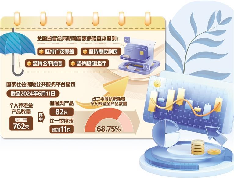 中国银行研究院研究员杨娟表示,普惠养老保险产品是特别契合个人养老金发展需要的产品。国家社会保险公共服务平台显示,截至2024年6月11日,个人养老金产品的数量增加至762只,其中保险类产品82只,比一季度末增加11只,占二季度以来新增个人养老金产品数量的68.75%。“这一增长趋势反映了普惠保险发展对于丰富个人养老金产品的支撑作用。”杨娟说。