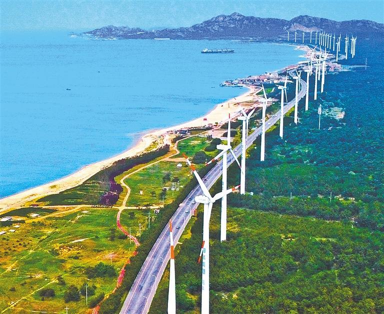 6月11日,在山东省荣成市成山镇沿海,风力发电机组正在转动工作。近年来,荣成市依托风能资源,在沿海建设了多处风力发电场,以清洁能源助力绿色发展。