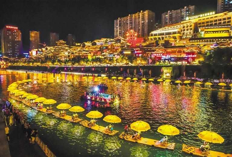 ▼6月4日,在湖北省宣恩县贡水河上,游客在观赏璀璨表演。