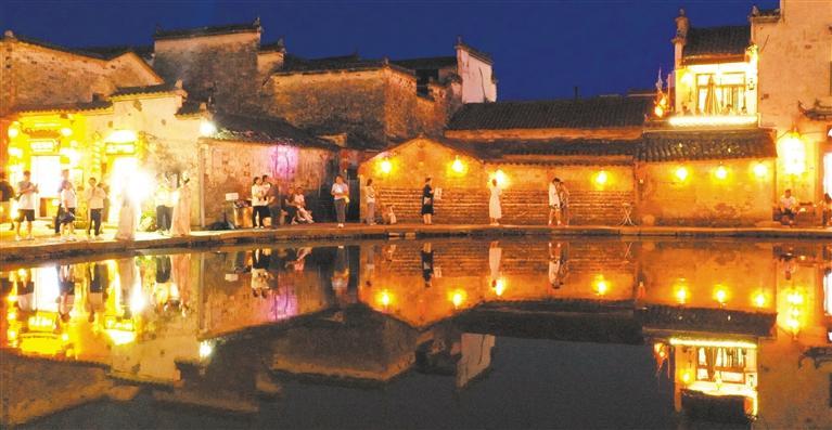 ◀6月13日,安徽省黟县宏村,游客在徽派建筑前拍照打卡。