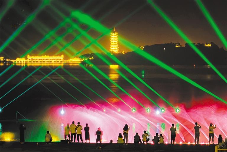 ▲5月14日,重庆市开州区汉丰湖景区的水幕光影吸引不少市民前来游玩。