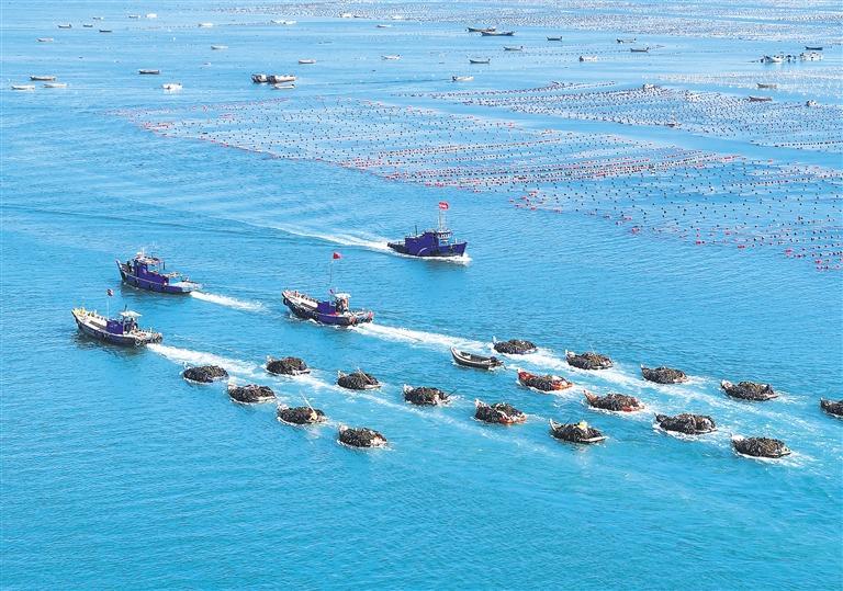 6月17日,山东省荣成市爱伦湾海带养殖区,满载海带的渔船正准备返港卸船。荣成市是我国主要的海带产地,每年6月是海带收获的繁忙时节。李信君摄(中经视觉)
