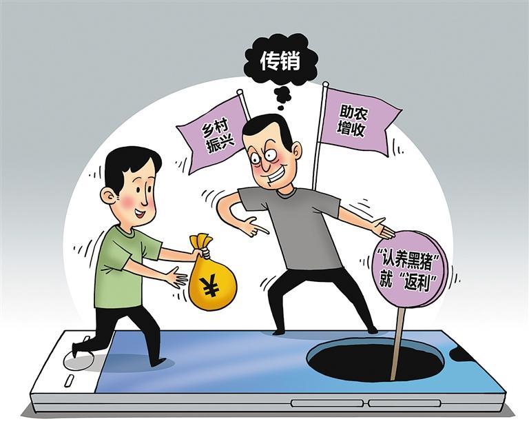 花5000元“认养”一头黑猪,之后每天都有“返利”;若发展新会员,可获得新会员认养金额20%的“返利”……靠这种方式,某APP两年收取会员资金4亿多元。近年来,不少不法分子打着“乡村振兴”“助农增收”等旗号,通过所谓的“认养”大搞网络传销,值得警惕。除了“黑猪认养”,网络传销也可能假借养牛、养羊、养鸡等外壳进行包装,容易让群众对国家的乡村振兴战略产生误解,社会危害性极强。各地应对此类假借乡村振兴等名义开展不法活动的情况进行摸排梳理,加大对新型网络传销犯罪的警示力度,形成打击传销的高压态势。同时,提高广大群众识别、防范、抵制传销的意识。群众当牢记,凡是要求交纳“门槛费”、拉人头发展下线、承诺下线入会即“返利”的,几乎都是传销。