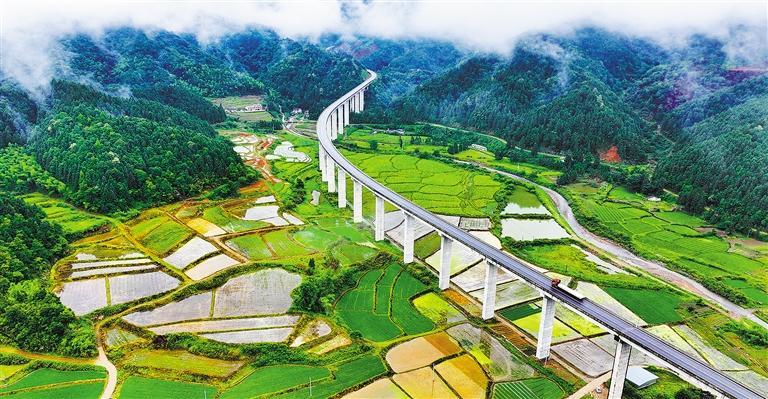 6月13日,江西省抚州市宜黄县黄陂镇霍源村,公路宛如一条巨龙穿过崇山峻岭,与附近的稻田、森林、河流等相映成趣,构成了一幅和美乡村生态画卷。