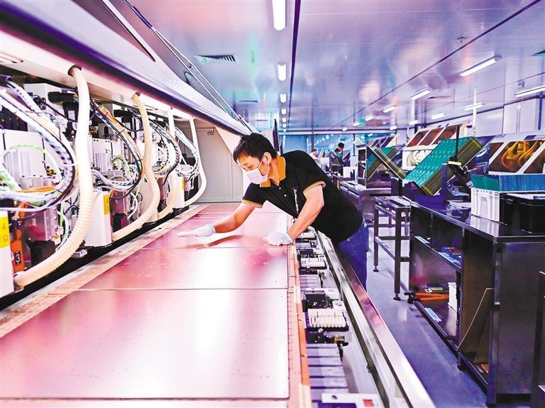 位于江西省赣州市信丰县工业园区的信丰迅捷兴电路科技有限公司的智能化车间里,工人在加工高精度印制电路板。近年来,当地加大政策、资金、技术等要素保障,加快传统企业转型升级,目前已建成数字化智能化示范车间26个。朱海鹏摄(中经视觉)