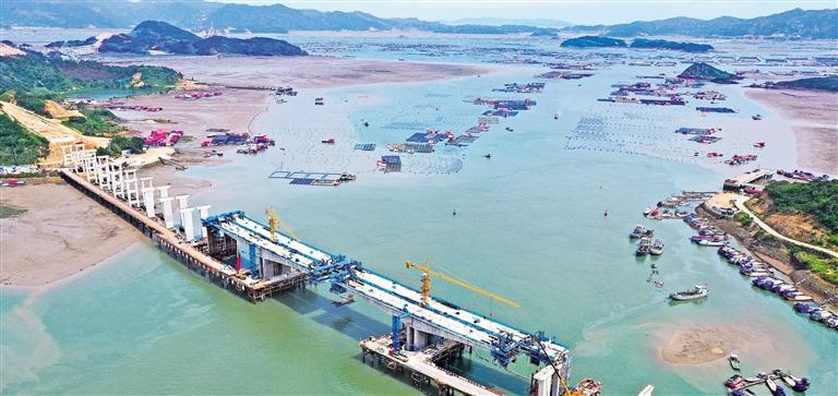 6月21日,位于福建省霞浦东安岛的宁上高速项目A2标段关门江跨海大桥正加紧施工。该项目建成后,将有利于进一步完善闽东高速公路网络,促进闽东经济发展。