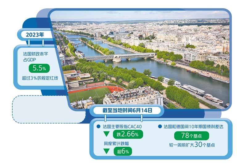 法国经济学界认为,极端政治势力在此次欧洲议会选举中展现了强劲势头,无论未来法国国民议会选举结果如何,“潘多拉魔盒”都已打开。一是虽然从整体而言,法国利差的上升与全球长期利率的反复波动相吻合,该事件对经济与市场的信心也可在后续进行修复,但极端政治势力实力上升已是无法回避的事实,其在选举中释放的“民粹催化剂”所引发的政治不确定性在短期内难以消除。二是此前曾有关于法国银行业的研究报告指出,对于欧洲银行业而言,银行股价下跌10%将导致对企业和家庭的贷款萎缩,相当于银行资产的0.3%,如果由此系数推算,将引发超过200亿欧元的萎缩规模。三是在欧洲议会选举前,法国已面临财政赤字不断扩大及信用评级机构敦促其减少庞大负债的双重压力。统计数据显示,2023年法国财政赤字占国内生产总值(GDP)的5.5%,超过3%的规定红线,而欧盟委员会近期持续警告,将对违反预算规则的国家启动过度赤字调查程序。同时,外部信心与预期正持续减弱,在国际信用评级机构标准普尔于5月31日因债务高企风险将法国主权信用评级从“AA”下调至“AA-”后,穆迪在6月10日警告,这场提前选举使法国财政重整面临的风险升高,将对其信用评级造成负面效应。