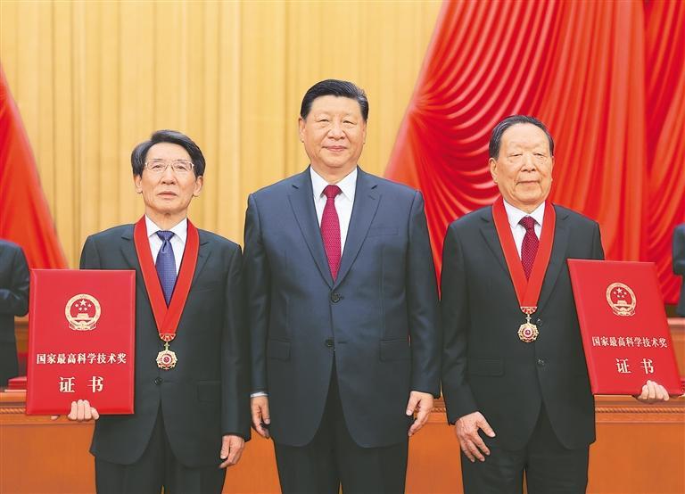 仪式号角响起,习近平首先向获得2023年度国家最高科学技术奖的武汉大学李德仁院士和清华大学薛其坤院士颁发奖章、证书,同他们热情握手表示祝贺。随后,习近平等党和国家领导人同两位最高奖获得者一道,为获得国家自然科学奖、国家技术发明奖、国家科学技术进步奖和中华人民共和国国际科学技术合作奖的代表颁发证书。
