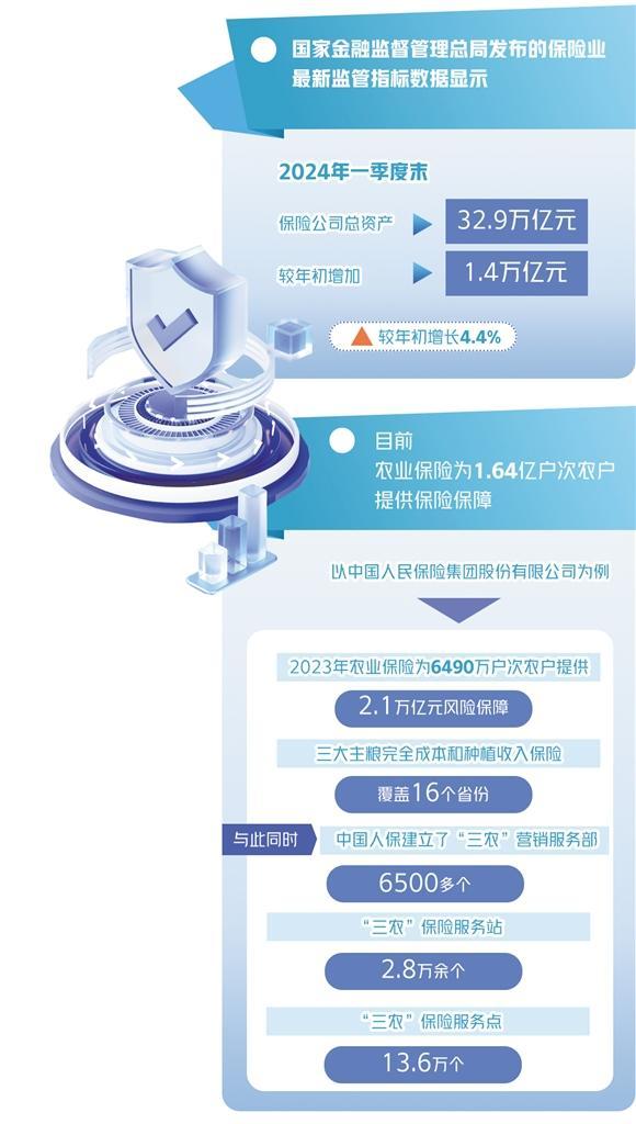 近年来,我国农业保险保费规模稳居全球前列。金融监管总局的数据显示,目前,农业保险为1.64亿户次农户提供保险保障。以中国人民保险集团股份有限公司(以下简称“中国人保”)为例,2023年农业保险为6490万户次农户提供2.1万亿元风险保障,三大主粮完全成本和种植收入保险覆盖16个省份。与此同时,中国人保建立了“三农”营销服务部6500多个,“三农”保险服务站2.8万余个,“三农”保险服务点13.6万个。