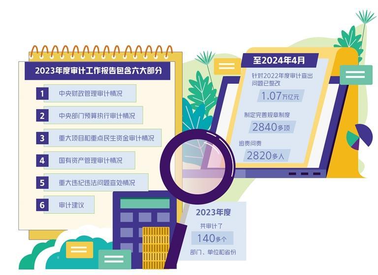 6月25日,受国务院委托,审计署侯凯审计长向十四届全国人大常委会第十次会议作了《国务院关于2023年度中央预算执行和其他财政收支的审计工作报告》(以下简称《报告》)。这份“沉甸甸”的报告聚焦中央财政管理、中央部门预算执行、重大项目和重点民生资金、国有资产管理等国计民生重点领域精准揭示问题和风险,展现“经济体检”的权威专业,彰显以民为本的责任担当。