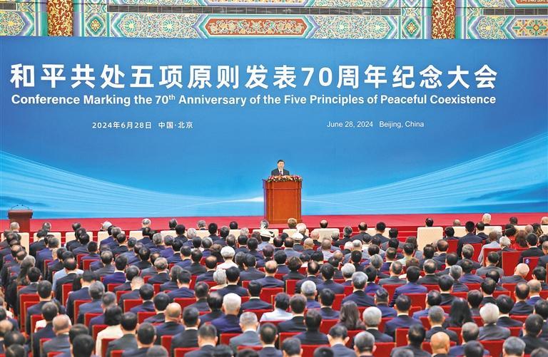 习近平指出,面对和平还是战争、繁荣还是衰退、团结还是对抗的历史抉择,我们比以往任何时候都更加需要弘扬和平共处五项原则的精神内涵,朝着构建人类命运共同体的崇高目标不懈努力。