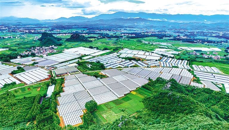 6月24日,在广西壮族自治区贺州市平桂区现代农业产业园,整齐排列的蔬菜大棚与田园、民居、山峦交相辉映,蔚为壮观。近年来,贺州市因地制宜发展大棚蔬菜产业,建成了广西最大的集中连片设施蔬菜产业长廊,打造粤港澳大湾区“菜篮子”高品质生产基地。