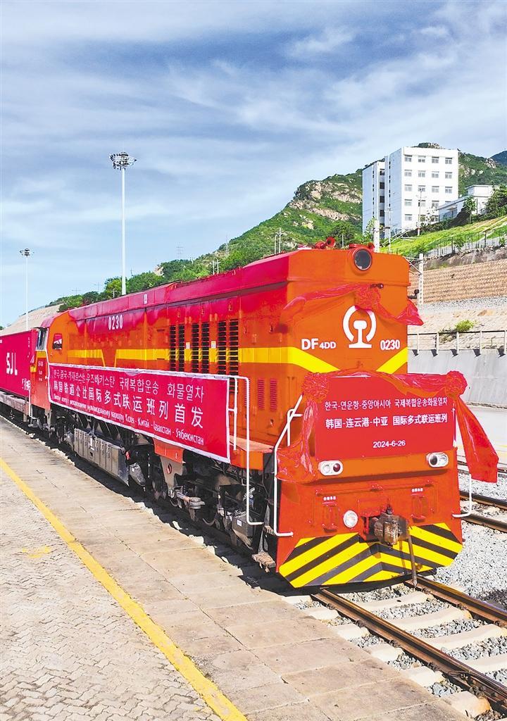 6月26日,“韩国—连云港—中亚”国际多式联运班列驶离中哈(连云港)物流合作基地。这列由韩国铁道公社首次参与运营的国际多式联运班列顺利发出,标志着“韩国—连云港—中亚”通道进一步稳固畅通。王健民摄(中经视觉)