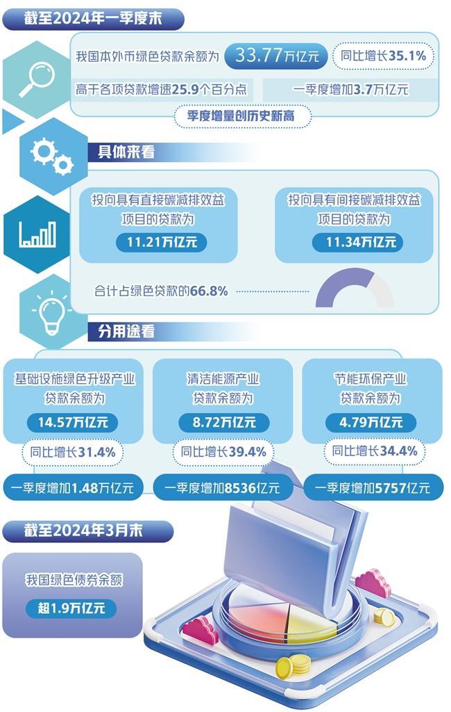 当前,金融对绿色发展的引领作用进一步凸显,绿色贷款保持高速增长,季度增量创历史新高。最新统计数据显示,截至2024年一季度末,我国本外币绿色贷款余额为33.77万亿元,同比增长35.1%,高于各项贷款增速25.9个百分点,一季度增加3.7万亿元,季度增量创历史新高。