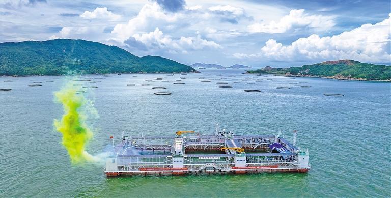 6月29日,半潜桁架式养殖平台“格盛1号”交付暨投产仪式在广东珠海桂山蜘洲岛海域举行。该平台创设多种应用场景,配置无人机起降平台及智能渔业管控系统,积极探索低空经济和海洋经济的有效融合,打造珠海现代化海洋牧场产业发展新模式。