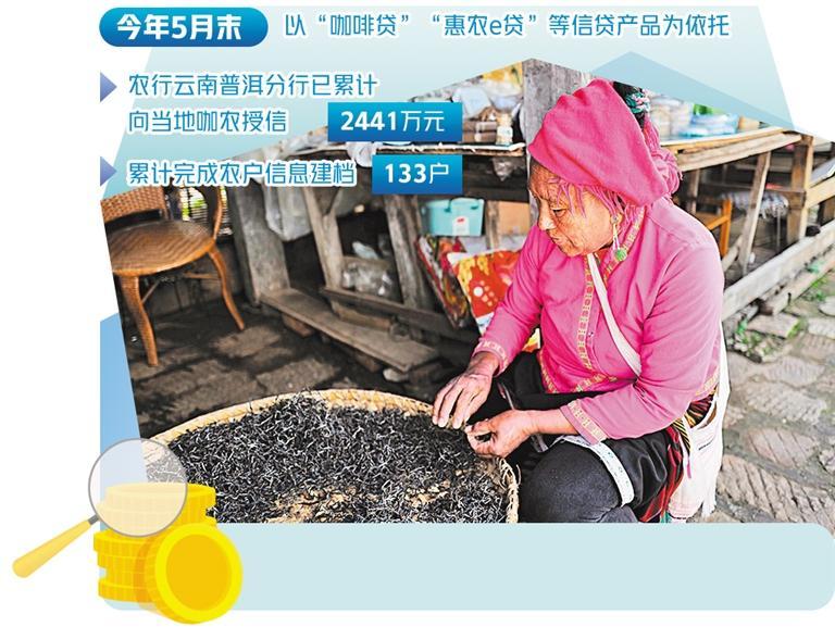 农行云南普洱分行工作人员介绍,为支持当地咖啡产业发展,分行在2022年创新推出“乡村振兴·咖啡贷”全系产品,根据产业链上客群范围的不同,又划分为面向农户的“咖农贷”,面向个体工商户、小微企业主等的“咖e贷”以及面向企业客户的“咖企贷”,有效填补了金融服务咖啡全产业链空白。截至今年5月末,以“咖啡贷”“惠农e贷”等信贷产品为依托,农行云南普洱分行已累计向当地咖农授信2441万元,累计完成农户信息建档133户,其中款项的主要用途为满足农户即时现金需求、咖啡加工设备更新等。