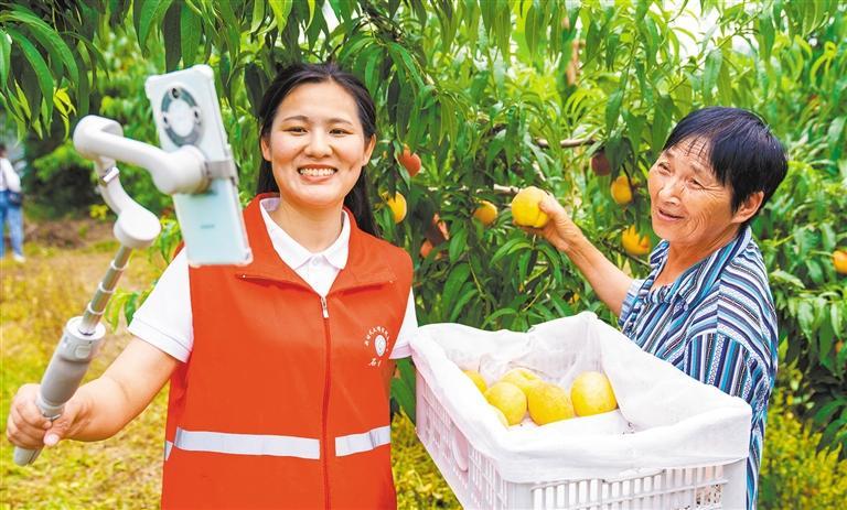 ▼6月24日,江苏省南通市通州区石港镇乐观村,果园的黄桃陆续成熟,青年志愿者通过直播方式帮助果农线上销售,助力增收。翟慧勇摄(中经视觉)