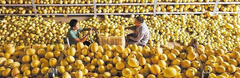 ▼6月25日,河南省正阳县汝南埠镇岗头村,村民在晾储丰收的金丝搅瓜。