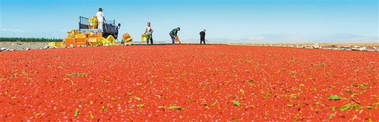 ▶6月22日,甘肃省嘉峪关市宏源公司农业种植园里,1.89万亩头茬枸杞喜获丰收。