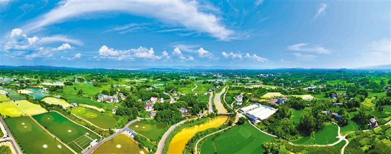 7月2日,重庆市梁平区礼让镇川西村,错落有致的农房掩映在田野中,与道路、河流、绿树等构成一幅美丽的夏日画卷。