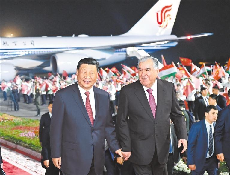 习近平乘车从机场赴下榻饭店途中,中塔两国国旗迎风飘扬,当地华侨华人和中资机构代表列队挥舞中塔两国国旗,热烈欢迎习近平访问塔吉克斯坦。