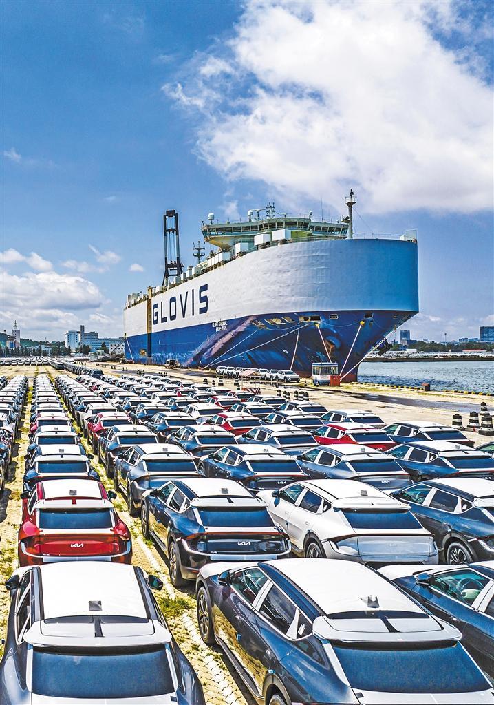 7月6日,在山东港口烟台港码头,商品车等待装船“出海”。近年来,烟台港积极打造商品车物流枢纽港,今年上半年完成商品车全模式运量36.7万辆,同比增长40.5%。张 超摄(中经视觉)
