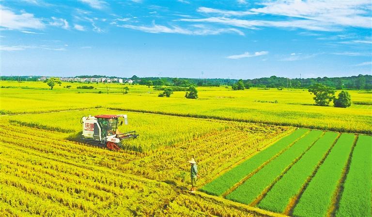 7月6日,江西省宜春市上高县新界埠镇洲上村,农机手正在收割早稻。当地早稻逐渐进入成熟期,农民趁晴好天气,抢收早稻,确保颗粒归仓。