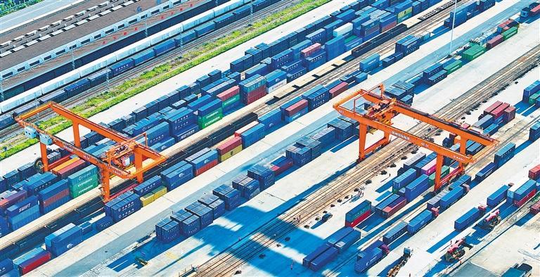 7月6日,位于江西省赣州市南康区龙岭镇的赣州国际陆港货场,货柜排列整齐。连日来,装载出口货物的中欧(亚)班列,从该港发车经霍尔果斯口岸出境,到达乌兹别克斯坦、哈萨克斯坦等多个中亚国家。