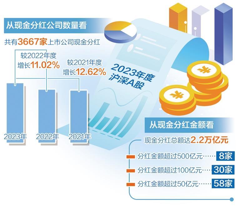 中国上市公司协会7月9日发布数据显示,2023年度沪深A股上市公司现金分红2.2万亿元,分红总额和公司数量均有新突破。上市公司分红意识不断增强,整体分红水平稳中有升。