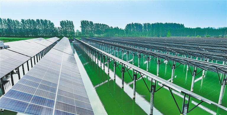 7月10日,安徽省亳州市谯城区十八里镇孙口村坑塘“渔光互补工程”。该项目占地约100亩,于2022年底并网发电,目前已累计安全运行460多天,发电量约700万千瓦时。这里曾是露天窑场烧砖取土的旧坑塘,如今已变成亳州市最大的坑塘光伏能源发电站。程伟如摄(中经视觉)