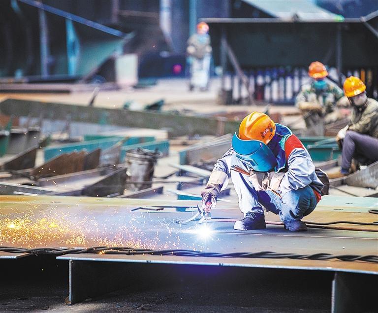 ◀7月8日,江苏南通市通州区,南通象屿海洋装备有限责任公司员工在赶制出口船舶订单。江苏省是全国船舶海工产业第一大省,各类船舶出口规模连续多年居全国首位。