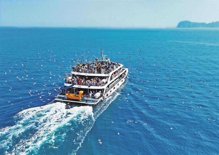 ◀7月10日,山东荣成市海驴岛景区迎来观鸥旅游热潮,游客乘游艇观海鸥、赏海景。当地开通环岛游专线,让游客感受海风清凉。