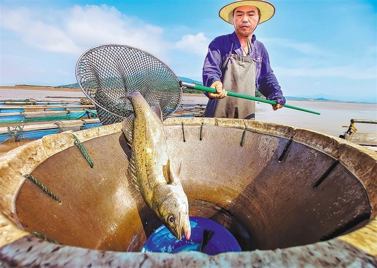 ▲7月11日,浙江温岭市坞根镇鲈鱼养殖户在收获鲈鱼。该镇主要养殖鲈鱼、紫菜、海带、牡蛎等水产品,养殖面积18800亩,年销售额超1亿元。
