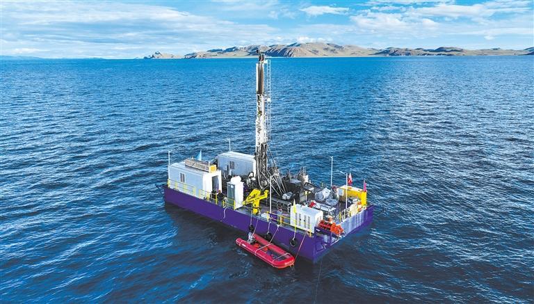 7月12日拍摄的纳木错水上钻探平台(无人机照片)。当日18时35分,在海拔超过4700米的纳木错中心湖区,多国联合科考队经过不懈努力,成功在湖底深度402.2米的地方获取了湖泊岩芯。这是我国首次在青藏高原大湖钻探中成功突破400米深度,对我国湖泊钻探与古气候的研究具有重要意义。新华社记者
