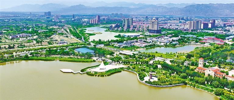 7月14日,俯瞰位于宁夏石嘴山市大武口区的星海湖,湖水清澈、湿地翠绿。近年来,当地统筹推进山水林田湖草沙系统治理,湖泊湿地生态环境持续改善。袁宏彦摄(中经视觉)