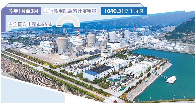 核能发展为经济社会发展提供了大量清洁能源。中国核能行业协会发布的信息显示,目前我国运行核电机组共56台(不含台湾地区),总装机容量为58218.34MWe(额定装机容量),居世界第三位。在建核电机组26台,总装机容量3030万千瓦,连续多年居世界第一位。今年1月至3月,运行核电机组累计发电量为1040.31亿千瓦时,占全国发电量的4.65%。
