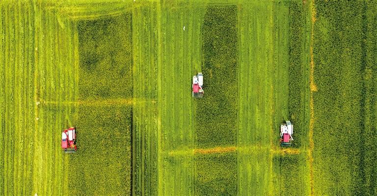 7月13日,浙江省金华市婺城区白龙桥镇下杨村“金早645”稻田里,多台收割机正在田间作业。今年,婺城区早稻种植面积达4.15万亩,比上年增加0.35万亩。目前,当地正抓紧抢收早稻。