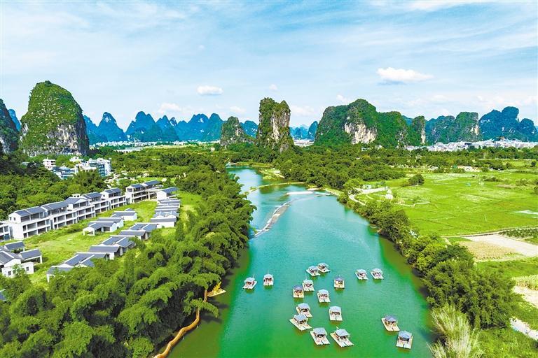 7月14日,在广西桂林市阳朔县遇龙河风景区万景码头,大批游客乘坐竹筏游览遇龙河。随着暑假的到来,阳朔县旅游进入旺季,各旅游景区迎来客流高峰,每天都有大批游客乘坐竹筏漂流,欣赏沿岸风光。黄胜林摄(中经视觉)