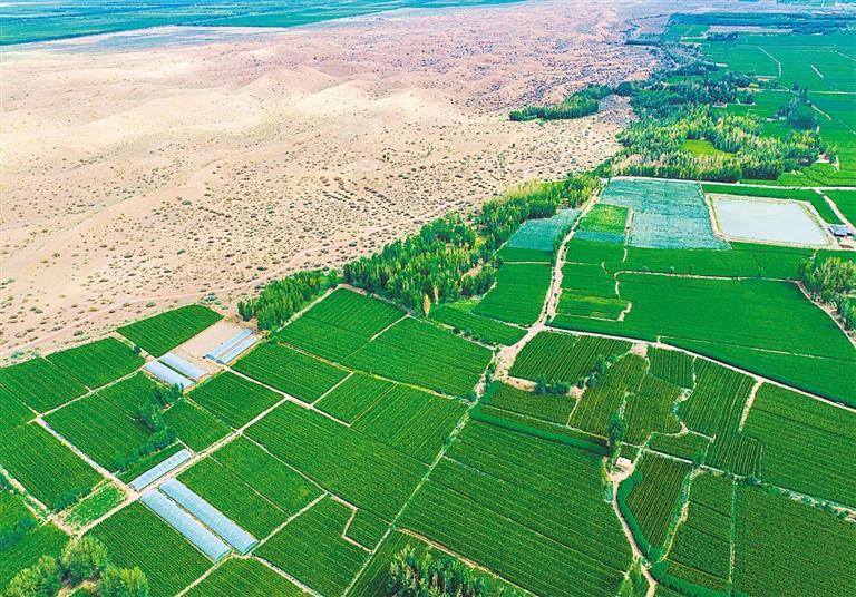 7月13日,甘肃省张掖市甘州区大满镇东闸村,昔日的黄色沙漠如今被绿油油的制种玉米所覆盖。近年来,当地依托防沙治沙生态治理项目,形成了防风固沙林带、农田防护林网的生态防护体系,实现了“绿进沙退”,夯实了生态安全基础。杨 潇摄(中经视觉)