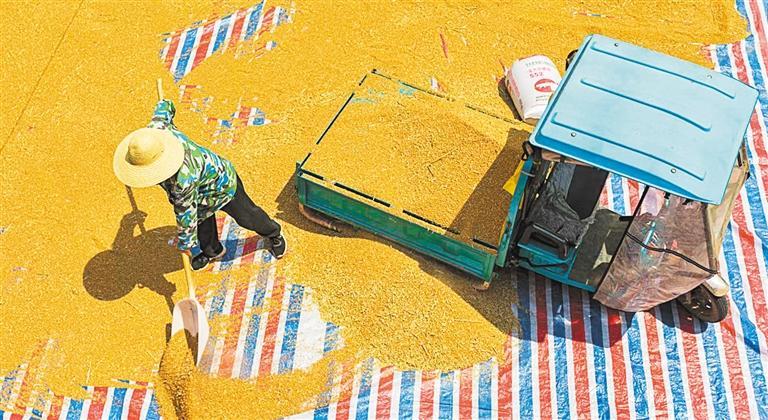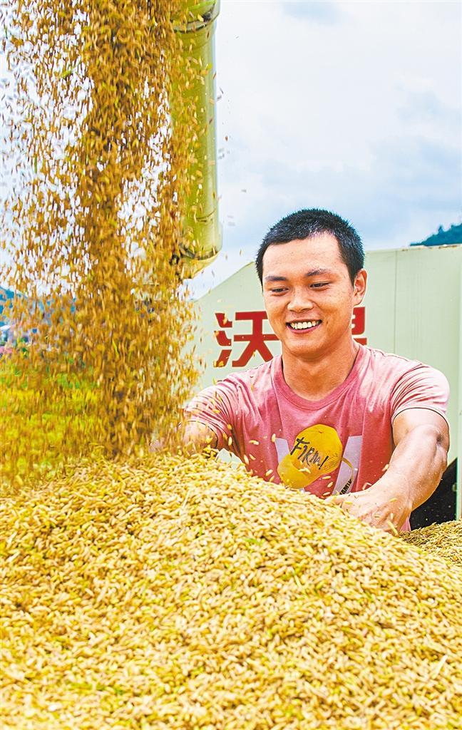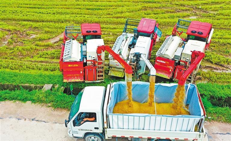 ▼7月13日,浙江省仙居县农民抢抓农时,将收获的夏粮从收割机卸入运输车。