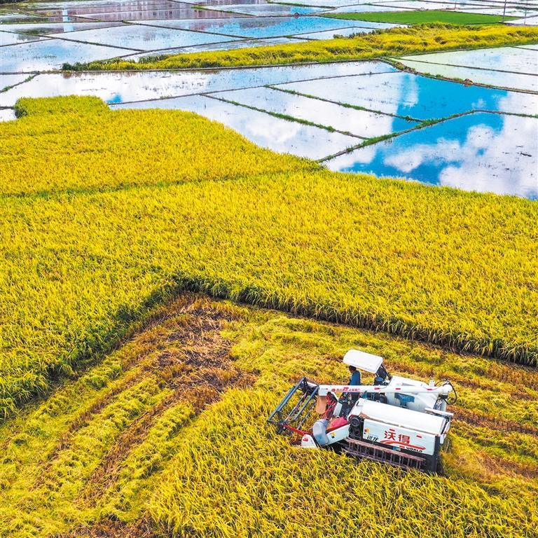 ▶7月6日,广西壮族自治区藤县藤州镇潭东村的高标准农田,农民驾驶收割机收割早稻。