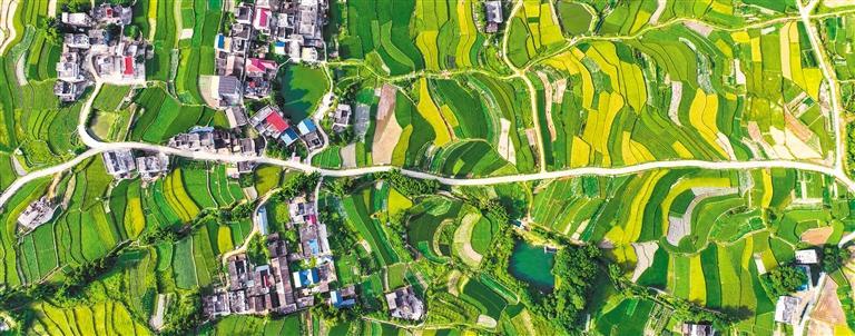 ▲7月12日,俯瞰江西省于都县马安乡,广袤田野中金灿灿的早稻、绿油油的中稻相互交织,与蜿蜒的公路、错落有致的民居构成一幅田园画卷。