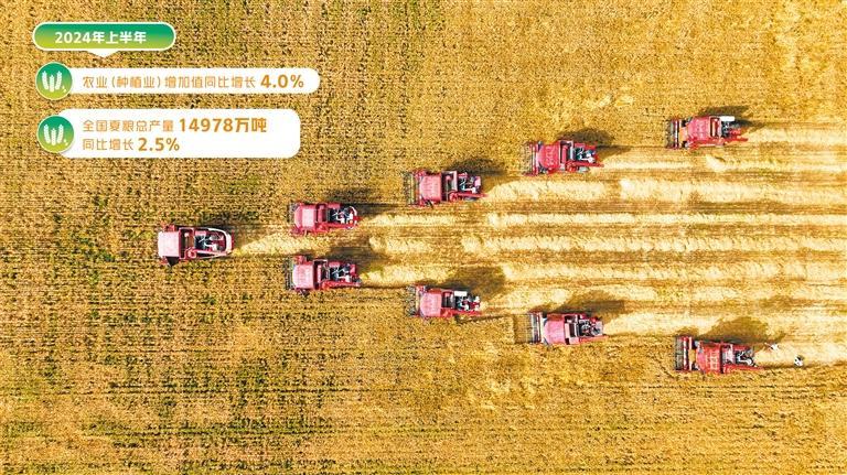 ▲7月9日,甘肃省金塔县金塔镇西沟村,多台大型联合收割机在麦田中穿梭。
