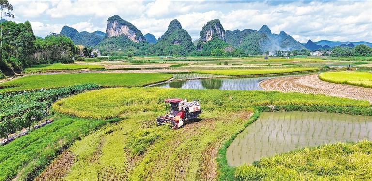 7月17日,在广西贺州市平桂区鹅塘镇,农机手正驾驶收割机收割早稻。近日,当地进入一年中农业生产最忙碌的“双抢”季节,田间地头各类农机来往作业,机声隆隆。