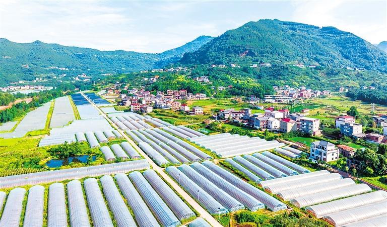 7月16日,重庆市开州区青吉村果蔬种植基地,大棚、村庄、绿树相映成景。近年来,开州区积极调整农业产业结构,因地制宜发展“大棚经济”,促进设施农业提质增效,拓宽群众增收渠道。 王晓宇摄(中经视觉)