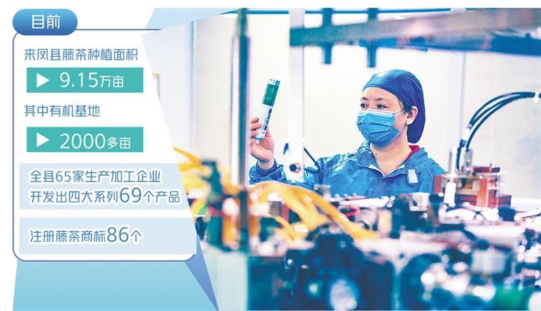 来凤县乡村投资建设有限责任公司统筹整合全县藤茶产业资源,建立集藤茶生产、加工、销售、研发于一体的全产业链。来凤乡投藤茶产业园于6月投产,年可生产藤茶20余吨,实现年销售额3000万元以上。该公司总经理汪天祥介绍,公司在北京、武汉、浙江青田建起藤茶直营店,上海、杭州的直营店也即将开业。