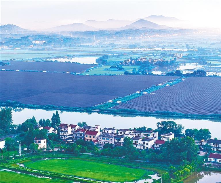 7月16日,在安徽省芜湖市繁昌区平铺镇新塘村,渔光互补光伏电站熠熠生辉。近年来,繁昌区依托当地水乡地理优势,聚焦绿色低碳转型发展,将光伏发电和渔业养殖相结合,形成“水上发电、水下养殖”的绿色养殖模式,实现生态效益、经济效益双丰收。