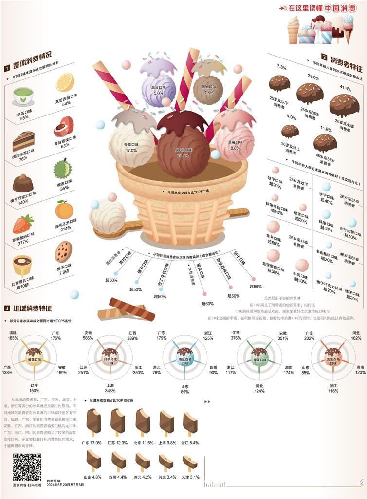 不同人群对冰淇淋产品也有不同的偏好。“00后”偏好饼干味、抹茶海盐味、绿茶味冰淇淋;“90后”青睐绿茶味、可可红茶味冰淇淋;“80后”消费者买走了更多的苹果味、芝芝葡萄味、牛乳味冰淇淋。