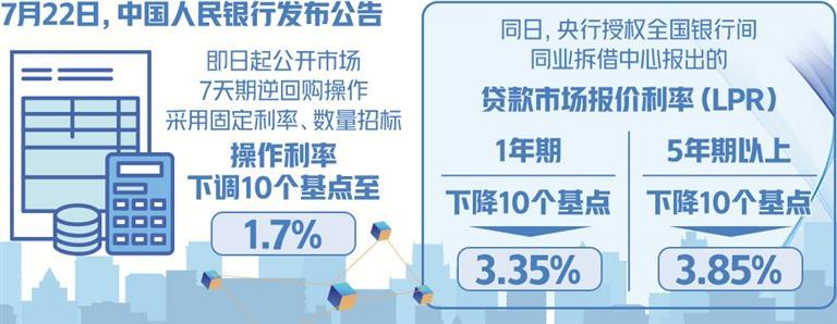 7月22日,中国人民银行发布公告,宣布即日起公开市场7天期逆回购操作采用固定利率、数量招标,操作利率由1.8%调整为1.7%。同日,央行授权全国银行间同业拆借中心报出的1年期和5年期以上贷款市场报价利率(LPR)均同步下降10个基点,分别降至3.35%和3.85%。此外,央行还决定适当减免中期借贷便利(MLF)操作的质押品。